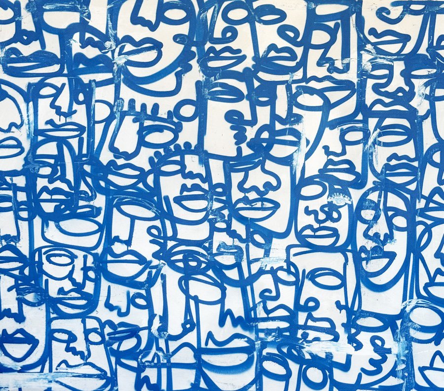 His paintings feature bold color, urgent line and brushwork, and graphic shapes and forms. His style combines painting and drawing, abstraction and representation, a specific use of mixed media materials and an eclectic iconography of figurative elements. While contemporary in his choice of materials and subjects, he bridges a wide range of historical influences, including, Neo-expressionism, surrealism, cubism and street art. He alters classical conventions of portraiture, and creates an allegorical narrative filtered through the lens of popular culture and daily experience within society.