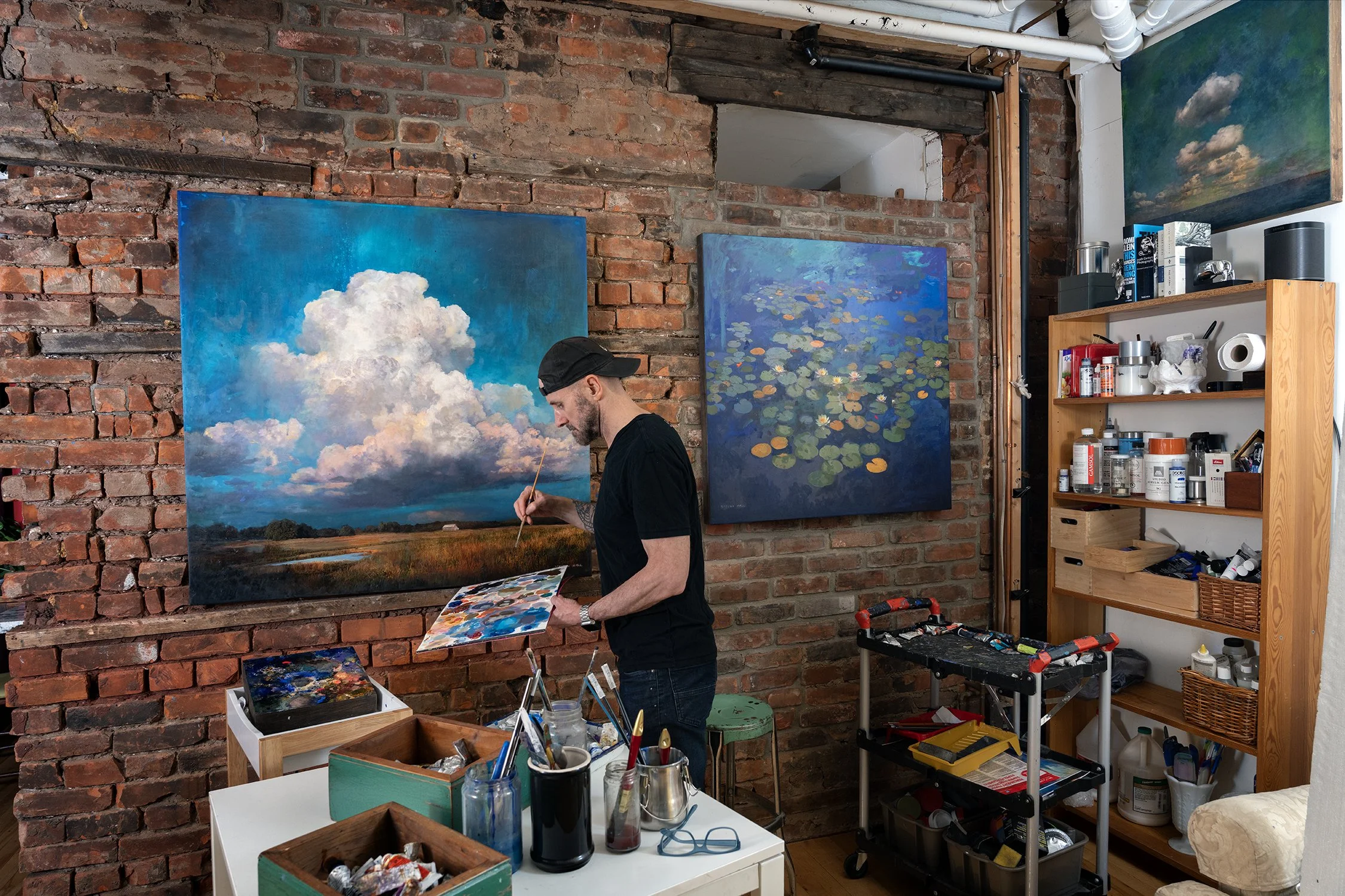 The resulting landscapes feel cinematic yet intimate, radiating both nostalgia and quiet melancholy. Hall’s dramatic skies and luminous horizons evoke what he describes as a “connection to the unknown,” an internal pilgrimage shaped by childhood memory and later life experiences, including the complexities of caring for his parents. His work captures the tension between beauty and impermanence.