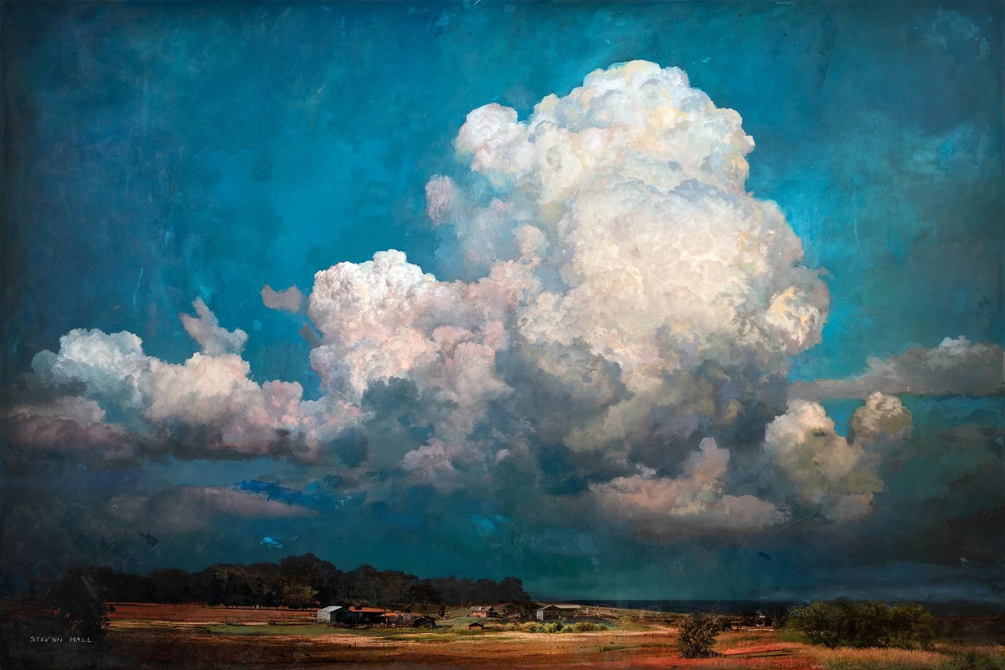 The resulting landscapes feel cinematic yet intimate, radiating both nostalgia and quiet melancholy. Hall’s dramatic skies and luminous horizons evoke what he describes as a “connection to the unknown,” an internal pilgrimage shaped by childhood memory and later life experiences, including the complexities of caring for his parents. His work captures the tension between beauty and impermanence.