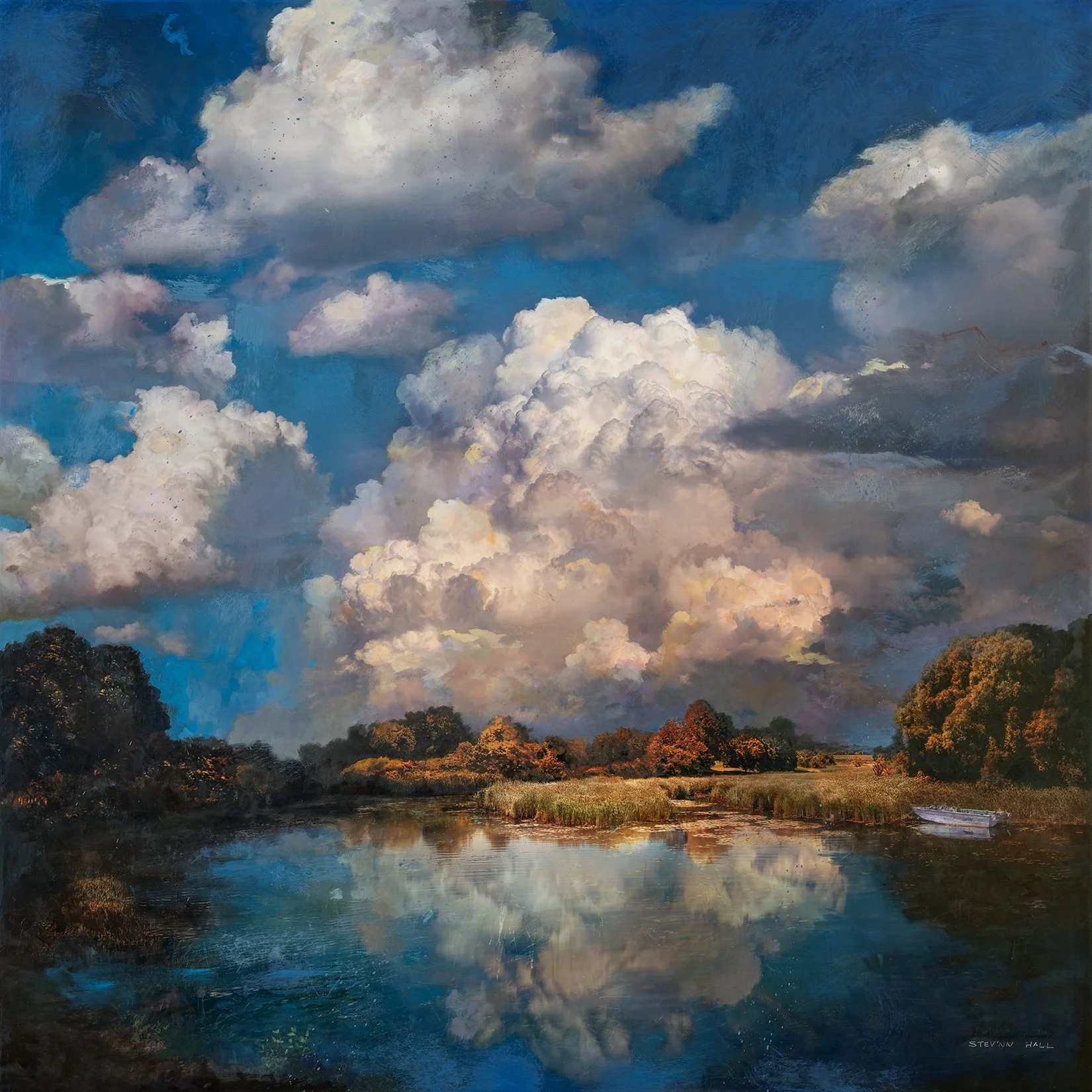 The resulting landscapes feel cinematic yet intimate, radiating both nostalgia and quiet melancholy. Hall’s dramatic skies and luminous horizons evoke what he describes as a “connection to the unknown,” an internal pilgrimage shaped by childhood memory and later life experiences, including the complexities of caring for his parents. His work captures the tension between beauty and impermanence.
