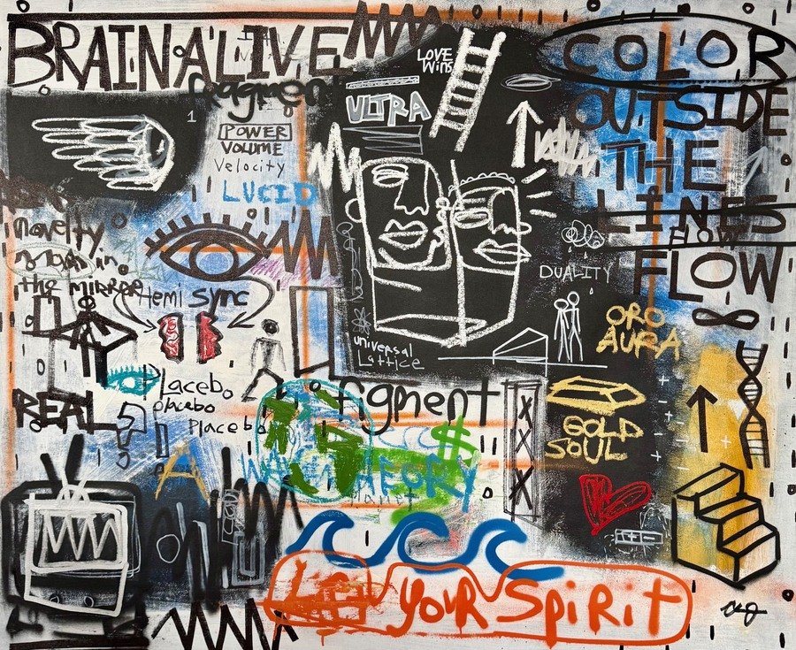 James’s paintings explore the interplay between consciousness, identity, and the human condition. Working in an abstract-figurative language, he blends bold color, urgent line work, graphic shapes, and symbolic mark-making. His compositions unite drawing and painting, representation and abstraction, and an eclectic mix of mixed-media materials. While grounded in contemporary aesthetics, his work engages a broad lineage of historical influences, from Neo-Expressionism, Surrealism, Cubism, and classical portraiture to the visual vocabulary of street art. Through this synthesis, James reimagines portraiture as an allegorical narrative rooted in popular culture, psychological depth, and lived social experience.