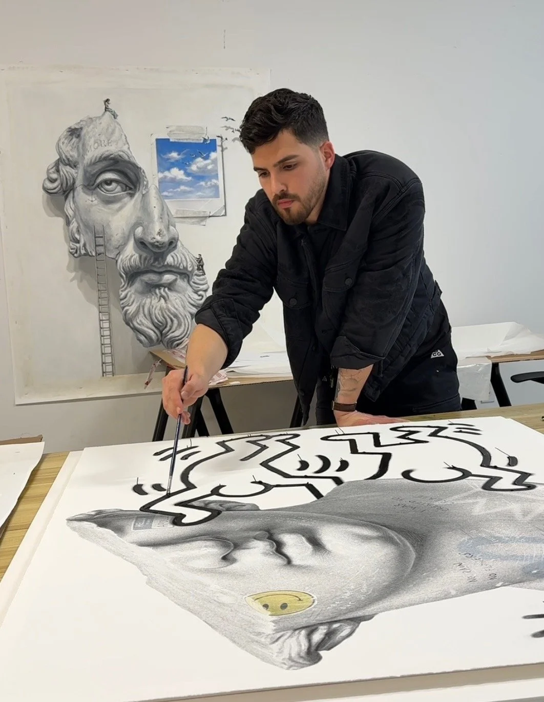 Presenting at the 2026 Venice Biennale, this new body of work introduces a rare dialogue between Kozo and the iconic visual language of Keith Haring. Familiar Haring motifs are reimagined through Kozo’s refined mixed media approach, where layering graphite, acrylic, lithography, and tattoo ink form richly dimensional compositions. Rather than reinterpretation alone, these works expand into immersive scenes where new depths are revealed with each viewing. Classical references and ancient symbolism are seamlessly interwoven with Haring’s unmistakable line-work, creating a juxtaposition between past and present. The result is a highly limited series of one-of-a-kind works that transform a globally recognized visual language into something entirely new, offering collectors a unique opportunity to acquire pieces that are both culturally resonant and distinctly contemporary.