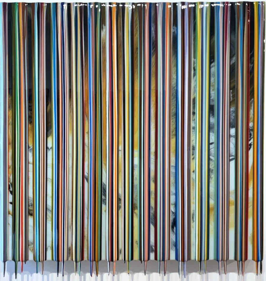 Valverde is best known for his visually electric, labor-intensive works created by pulling pigmented resin through pastry bags, allowing the medium to be extruded in uniform lines across the canvas. This “painting without brushes” method results in hypnotic surfaces filled with movement, density, and an almost sculptural physicality. Though at first glance his works appear digital or mechanically produced, every line is applied by hand, embedding controlled gestures into a field of precision.