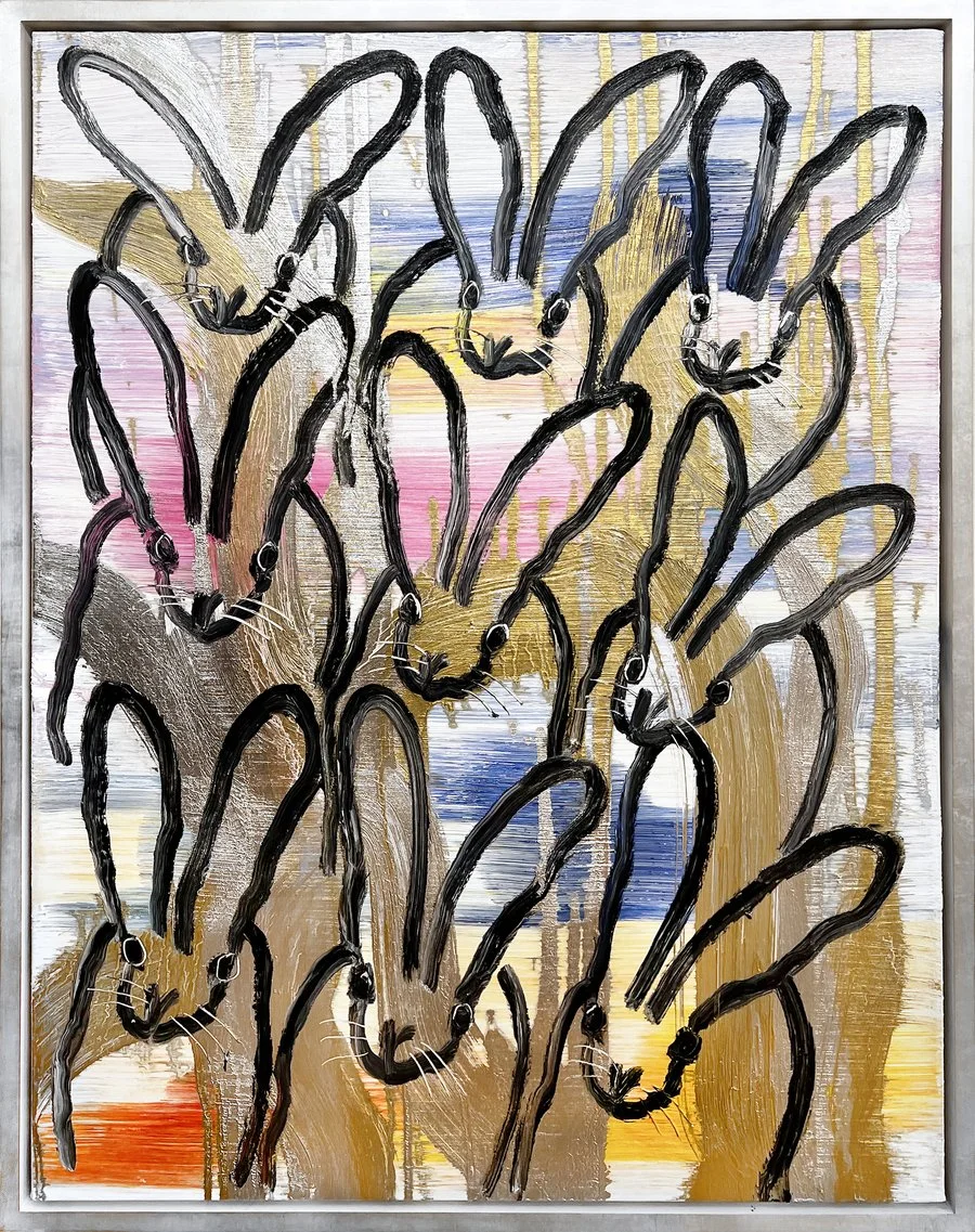 Born in Kittery, Maine, and raised across the U.S. and Hawaii, Slonem developed an early fascination with color, ritual, and the natural world. His studies at Tulane University and travels through Mexico and Nicaragua further shaped his artistic and spiritual vocabulary, inspiring early works infused with religious and cultural symbolism. After moving to New York in the 1970s, he refined his now-signature serial imagery (his bunnies, butterflies, and birds most notably) drawing inspiration from both Pop Art’s repetition and the meditative power of daily artistic practice. He spent time in the studio with other impressive artistic figures, one influential artist being Andy Warhol, whose use of diamond dust in the Factory has inspired Hunt to continue using the medium in his own pieces today as an homage.