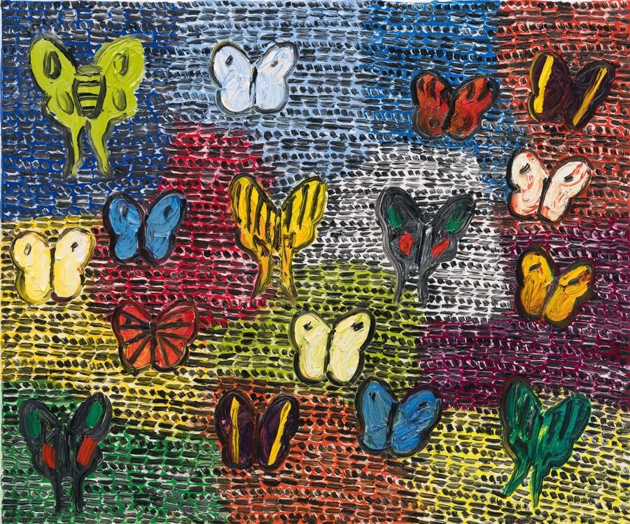 Born in Kittery, Maine, and raised across the U.S. and Hawaii, Slonem developed an early fascination with color, ritual, and the natural world. His studies at Tulane University and travels through Mexico and Nicaragua further shaped his artistic and spiritual vocabulary, inspiring early works infused with religious and cultural symbolism. After moving to New York in the 1970s, he refined his now-signature serial imagery (his bunnies, butterflies, and birds most notably) drawing inspiration from both Pop Art’s repetition and the meditative power of daily artistic practice. He spent time in the studio with other impressive artistic figures, one influential artist being Andy Warhol, whose use of diamond dust in the Factory has inspired Hunt to continue using the medium in his own pieces today as an homage.