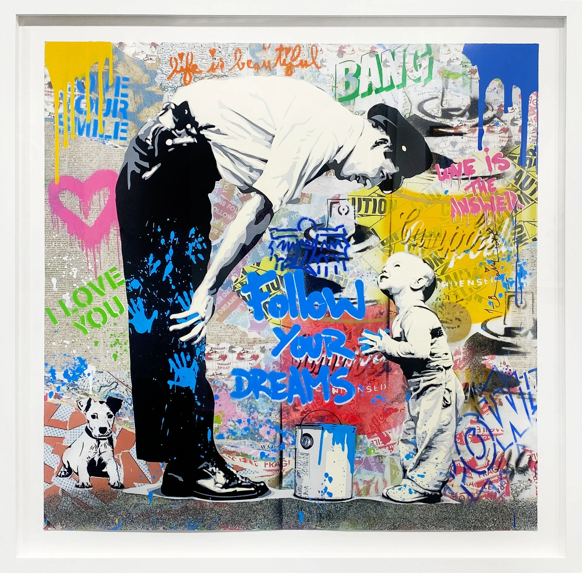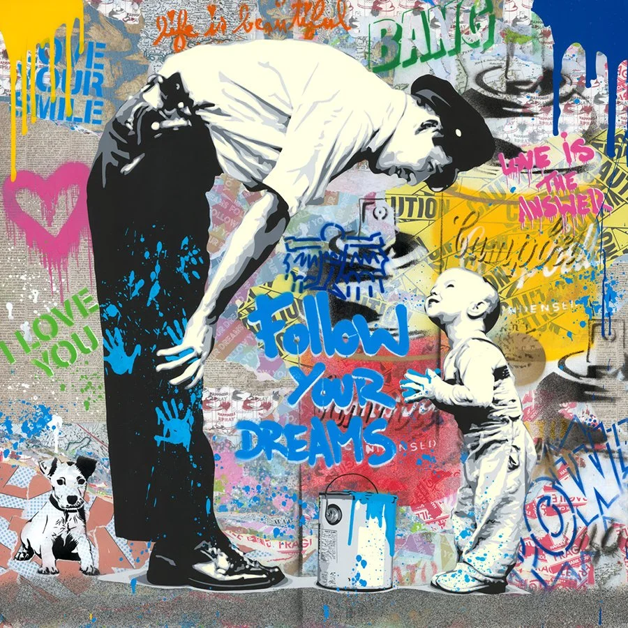 Mr. Brainwash’s work blends graffiti, stenciling, silkscreen, printmaking, painting, and sculpture through a bold visual vocabulary that merges pop-art iconography with urban sensibility. Juxtaposing classic cultural images, historic figures, cartoons, celebrities, and exuberant slogans, his works pulse with humor, nostalgia, satire, and unabashed optimism. Signature motifs include his “Life Is Beautiful” signage and large-scale reinterpretations of pop-culture archetypes, as well as new recurring imagery such as the Beautiful Girl series (2023–2025) and sculptural works that transform everyday or luxury objects into pop-infused statements.