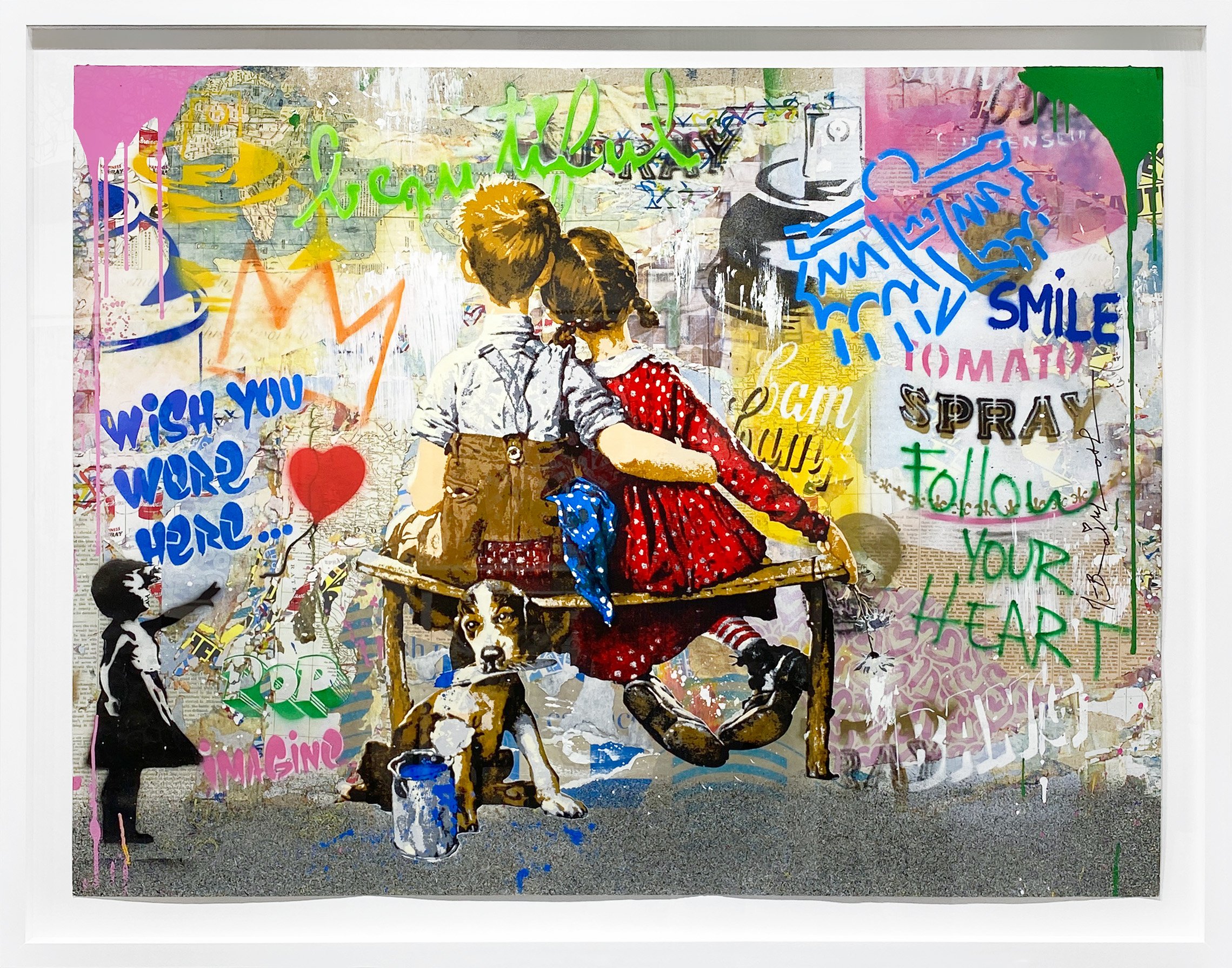 Mr. Brainwash’s work blends graffiti, stenciling, silkscreen, printmaking, painting, and sculpture through a bold visual vocabulary that merges pop-art iconography with urban sensibility. Juxtaposing classic cultural images, historic figures, cartoons, celebrities, and exuberant slogans, his works pulse with humor, nostalgia, satire, and unabashed optimism. Signature motifs include his “Life Is Beautiful” signage and large-scale reinterpretations of pop-culture archetypes, as well as new recurring imagery such as the Beautiful Girl series (2023–2025) and sculptural works that transform everyday or luxury objects into pop-infused statements.