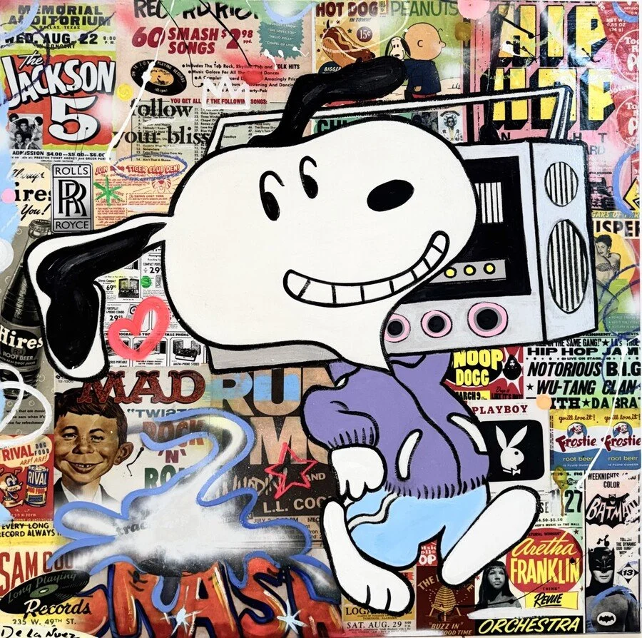 De La Nuez emerged in the early 1980s with a bold pop-culture-forward style featuring Monopoly imagery, vintage board games, pin-ups, Chanel motifs, retro advertising, and glamorous lifestyle references. While rooted in Pop Art’s legacy, he expanded the genre into something distinctly his own. His trademarked technique, “Art on the Edge,” features fully painted sides on canvas and wood, creating multidimensional works that extend beyond the traditional picture plane. He is listed among the “Who’s Who of the Most Collected Artists of Our Time,” and his pieces are known for their originality, humor, and visual impact.
