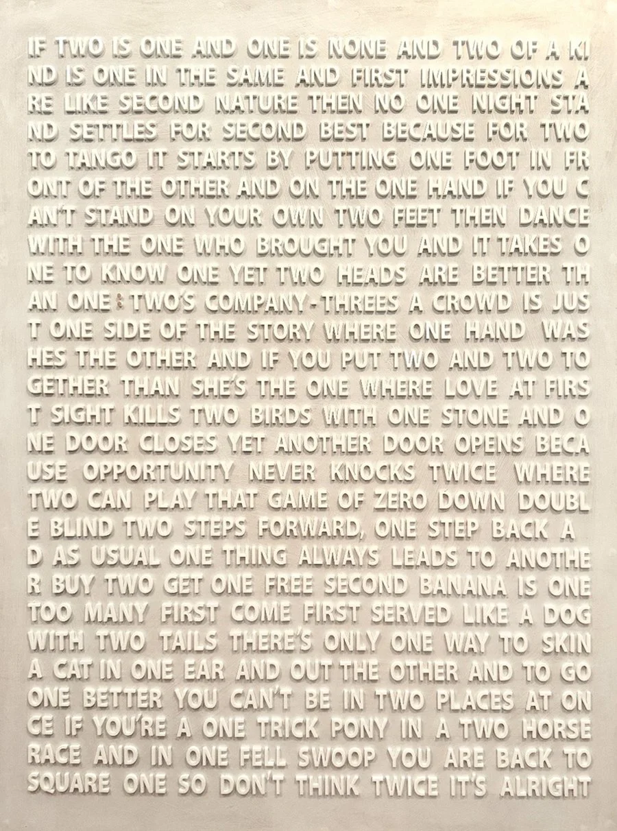 A hallmark of Buchman’s practice is the interplay between language and image. His “voice-over” series incorporates colloquial phrases, cultural references, pop-culture humor, and coded messaging, blending them with textural surfaces built from wood, plexiglass, resin, enamel, and layered mixed media. His process of building up material and then sanding, scraping, or excavating it, mirrors the layered nature of personal and collective memory, diaspora, communication, and identity.